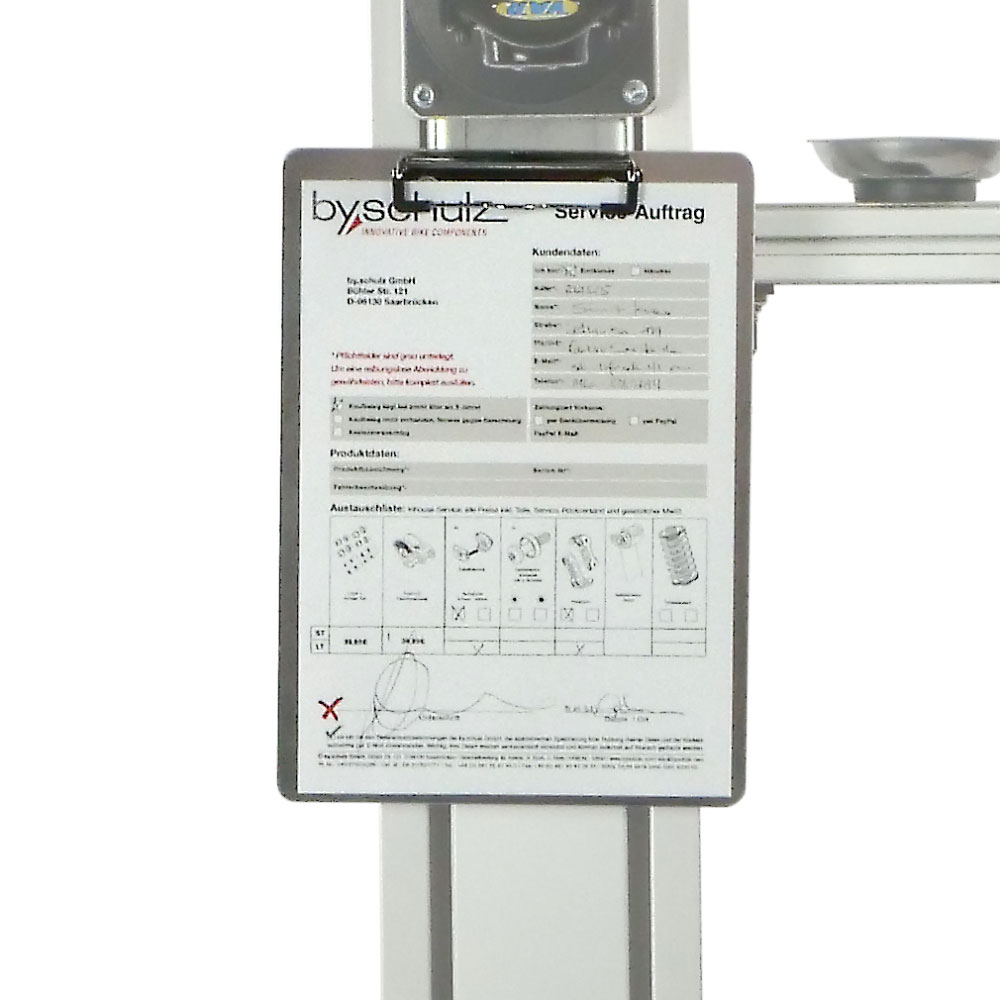The aluminum clipboard is perfect as a writing surface in the service area, it can be attached to the e-bike lifter, for example, via the magnetic strip.
