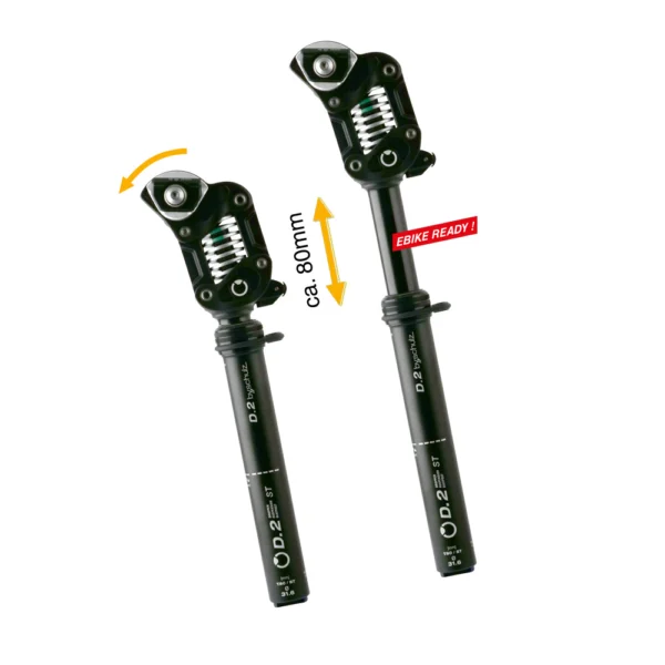 The D.2 ST-Ro is both a mechanically controlled variable seat post for continuously varying the seat height and high safety at stops, as well as sensitive suspension post with 30 mm travel. Ambitious (E) city and trekking bikers experience with this first-class manufactured parallelogram seatpost on gravel or cobblestones in the urban environment highest ride comfort! This spring comfort can be optimized by means of the steel spring available in 4 spring stiffnesses exactly to the rider’s weight. This is how the D.2 ST-Ro works for riders weighing 45 to 130 kg. Via the ergonomic handlebar control lever, the rider playfully lowers this vario/spring support by 80 mm before descending, then benefits from a secure stand, e.g. when stopping at traffic lights, from the lower body center of gravity and best riding control. The external cable guide facilitates maintenance work.