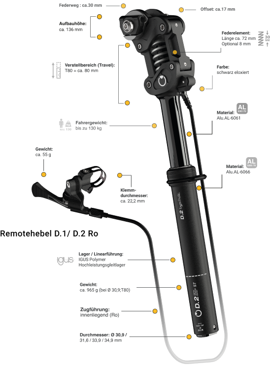 Infolge ihres progressiven Charakters nutzt die G.2 LT gefederte Fahrrad Sattelstütze ihre 50 mm Federweg selbst bei wuchtigen Schlägen optimal kontrolliert. Die G.2 LT Federsattelstütze erlaubt kinderleichte Sattel- und Federwechsel; das Fahrergewichts-Spektrum reicht von 45 bis zu 150 kg.