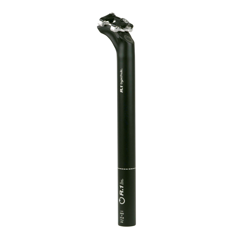 The seat posts of the by,schulz R. series are forged from high-strength 3D aluminum and are available in a length of 350 mm. Their surface is sandblasted, black matt anodized and provided with a scale. Their 2-bolt clamping system allows the saddle to be fixed in a stepless and stable manner. The version with 17 mm offset is available with 27.2 / 30.9 and 31.6 mm, the version with 23 mm offset is available with diameters of 27.2 and 31.6 mm.
