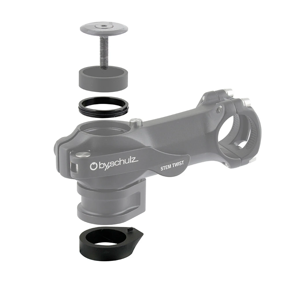 The by,schulz Top Cap Spacer has a height of approx. 5mm and is made of black anodized aluminium with an O-ring integrated on the outer radius. It fits especially on the Stem Twist SDS and Stem Twist Pro SDS stems, this is absolutely necessary if spacers above the stem or a standard A-head cap are to be installed instead of the original by,schulz cap.