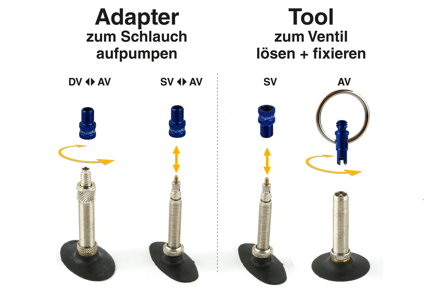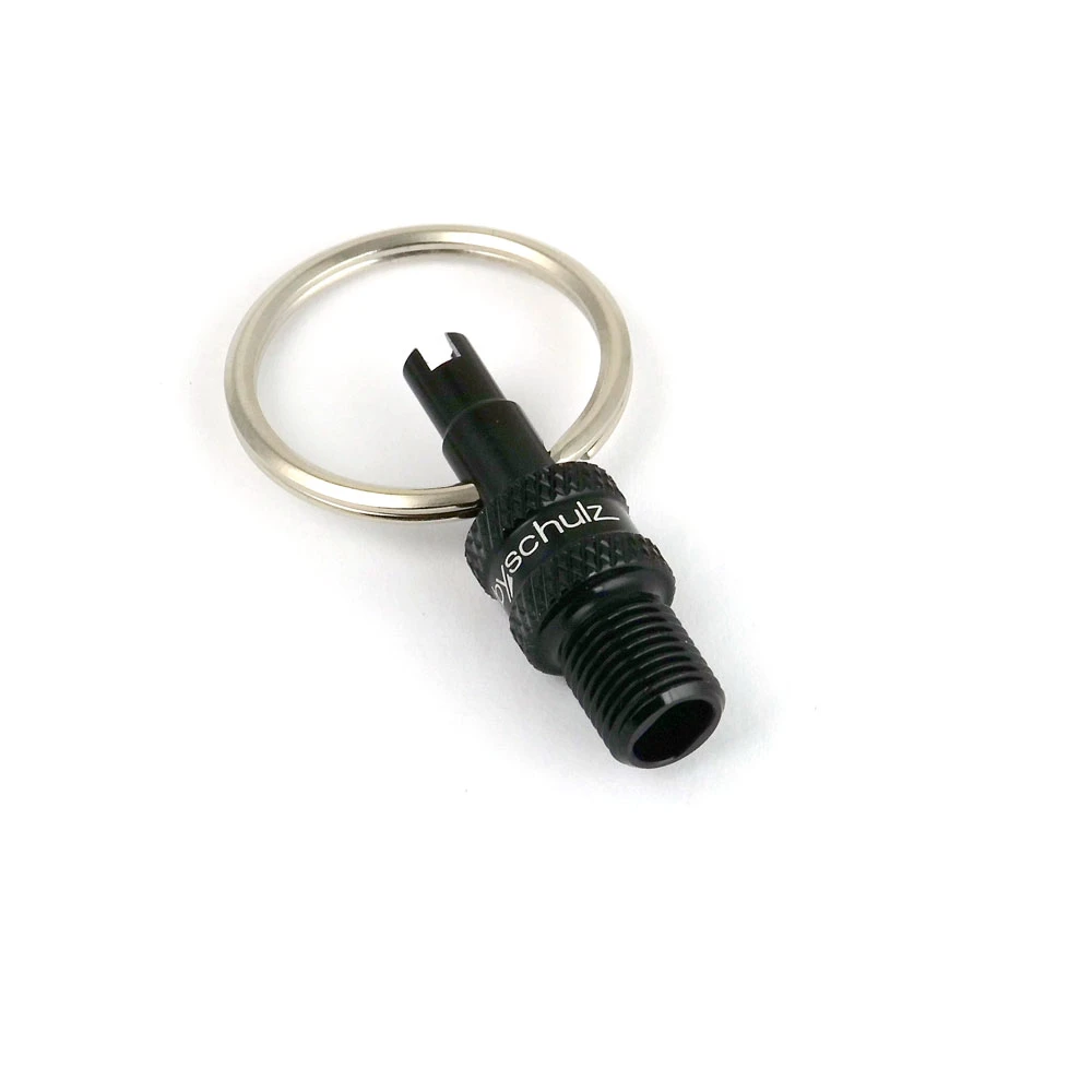 It’s often the little things that make a big difference. For example, when it comes to inflating a tire on the road. You don’t take a large pump with you, and it’s a hassle with a small one. With our practical valve adapters, which you carry on your key ring, you can inflate your bike at the service station in no time at all. The small “all-rounders” made of anodized aluminium fit DV or SV valves and conjure up a car valve connection. The two tool functions are also helpful. If a valve does not fit properly, it can be tightened or replaced.