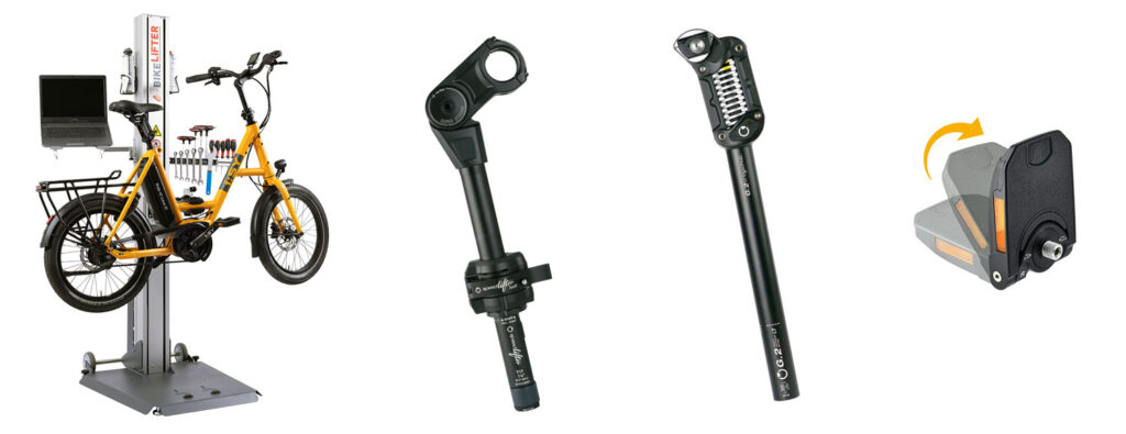 Produkthighlights: v.l.n.r. e-Bikelifter BM-60, Speedlifter Twist Pro 2, G.2 Sattelstütze, Z.1 Faltpedal